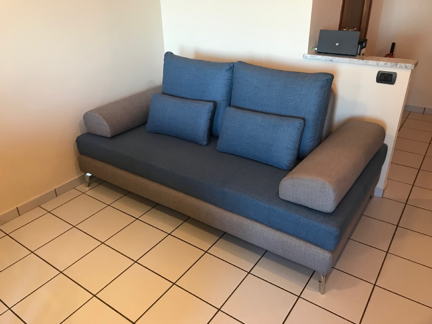 Divano modello vela con schienali mobili che scorrono sulla seduta accorciando/aumentando la profondità della seduta stessa La seduta è profonda 110 e con gli schienali tutti protratti indietro può formare un comodissimo letto da una piazza e mezzo Completamente smontabile e sfoderabile,personalizzabile e fattibile su misura